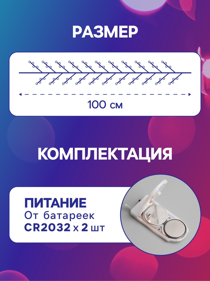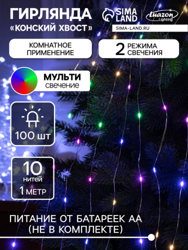 Гирлянда «Мишура» 1 м роса, IP20, серебристая нить, 20 LED, батарейки CR2032×2 (в комплекте), свечение мульти