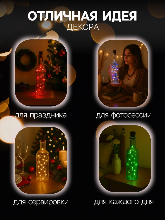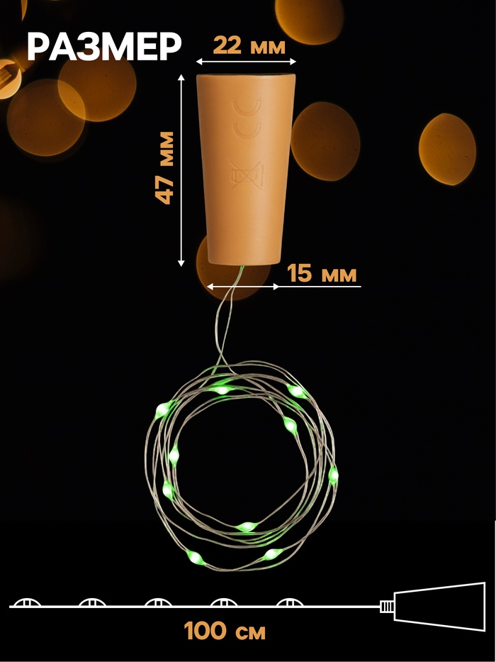 Гирлянда «Нить» 1 м роса с пробкой, IP20, серебристая нить, 10 LED, батарейки LR44×3 (в комплекте), свечение зелёное