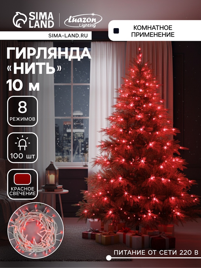Гирлянда «Нить» 10 м, IP20, белая нить, 100 LED, 8 режимов, 220 В, свечение красное