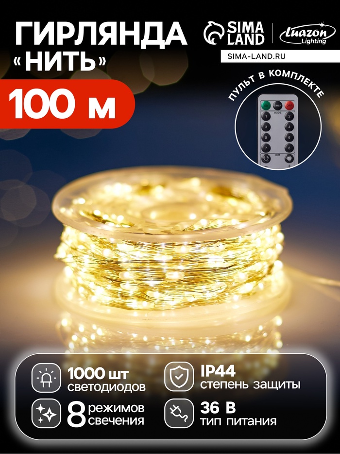 Гирлянда «Нить» 100 м роса, IP44, серебристая нить, 1000 LED, пульт, 36 В, свечение тёплое белое