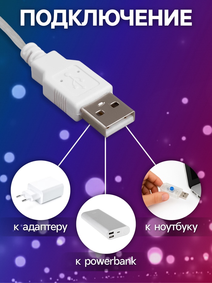 Гирлянда «Нить» 2 м роса, IP20, серебристая нить, 20 LED, свечение мульти (RGB), переливы, USB