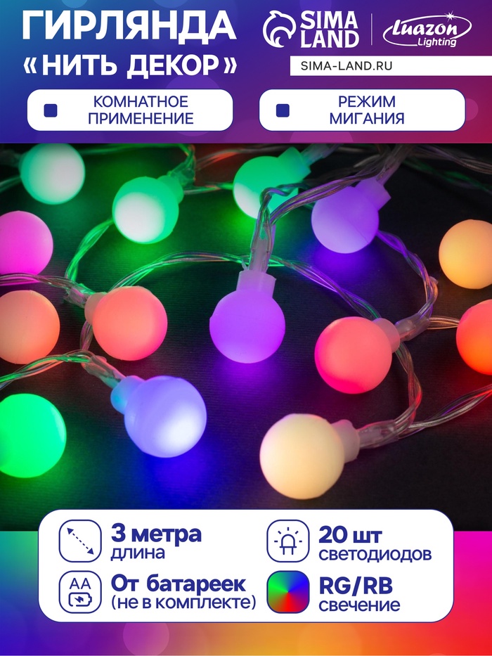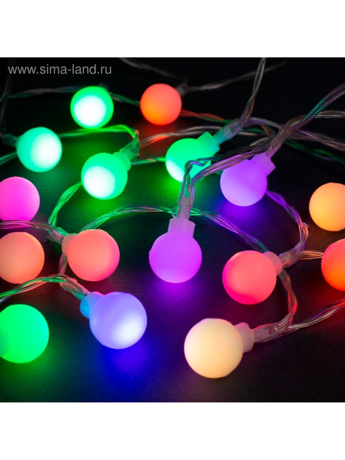 Гирлянда «Нить» 3 м с насадками «Шарики», IP20, прозрачная нить, 20 LED, батарейки AAх3 (нет в комплекте), свечение мульти