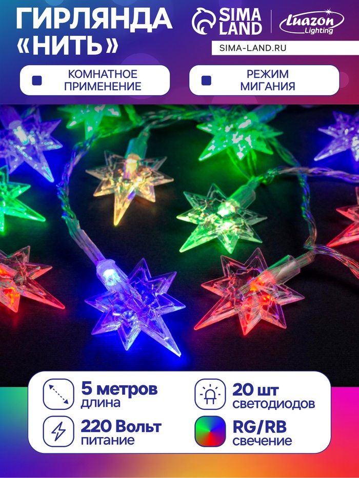 Гирлянда «Нить» 5 м с насадками «Звёзды», IP20, прозрачная нить, 20 LED, свечение мульти (RG/RB), мигание, 220 В