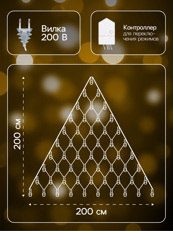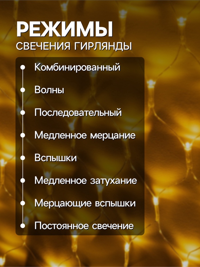 Гирлянда «Сеть-ёлка» 2×2 м, IP20, тёмная нить, 152 LED, свечение тёплое белое, 8 режимов, 220 В