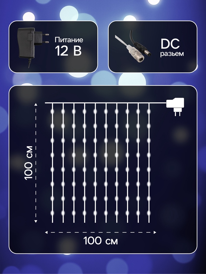 Гирлянда «Занавес» 1×1 м роса, IP20, серебристая нить, 100 LED, свечение белое, 12 В