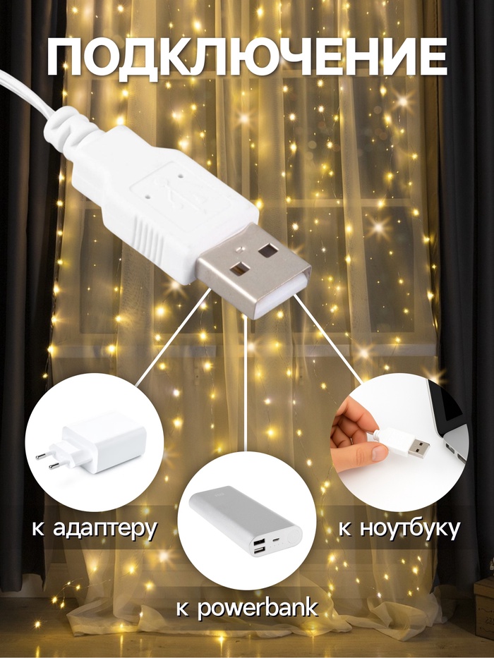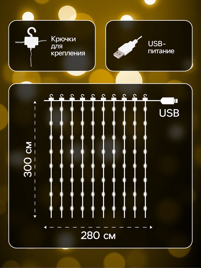 Гирлянда «Занавес» 2.8×3 м роса на крючках, IP20, серебристая нить, 300 LED, свечение тёплое белое, мерцание, USB