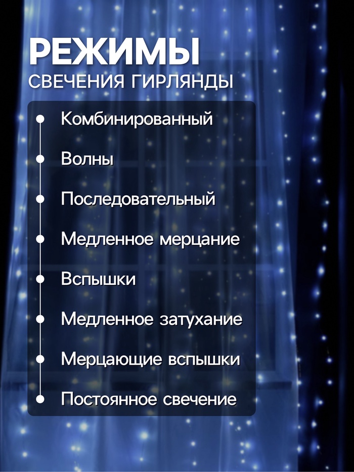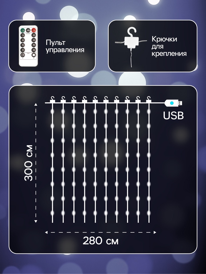 Гирлянда «Занавес» 2.8×3 м роса на крючках, с пультом, IP20, серебристая нить, 300 LED, свечение белое, 8 режимов, USB