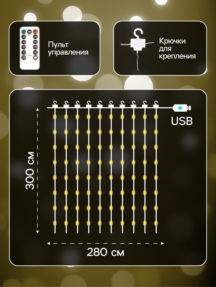 Гирлянда «Занавес» 2.8×3 м роса на крючках, с пультом, IP20, серебристая нить, 300 LED, свечение тёплое белое, 8 режимов, USB