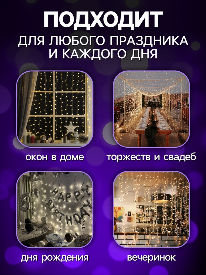 Гирлянда «Занавес» 2×2 м роса, IP20, серебристая нить, 300 LED, свечение мульти, 12 В