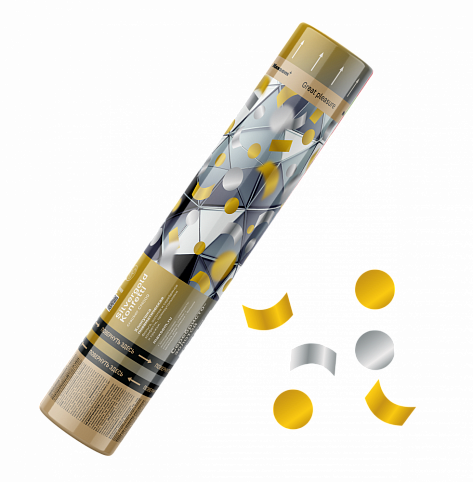 Наполнитель: Золотые, серебряные конфетти-прямоугольники и конфетти-кружки из фольги.