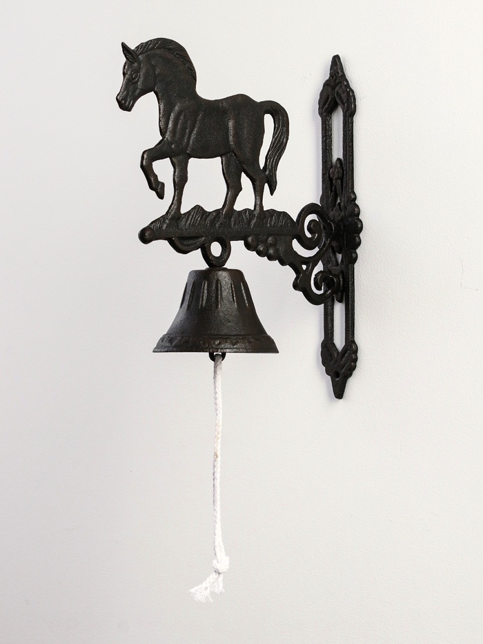 Настенный колокол с изображением коня выполнен из прочного чугуна — материала, который гарантирует долгий срок службы и устойчивость к погодным условиям. Его коричневое покрытие подчеркивает благородство и надежность, органично вписываясь в интерьер или экстерьер дома с классическим или рустикальным стилем.