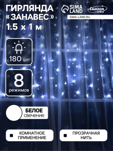 Гирлянда «Занавес» 1.5 × 1 м, IP20, прозрачная нить, 180 LED, свечение жёлтое, 8 режимов, 220 В