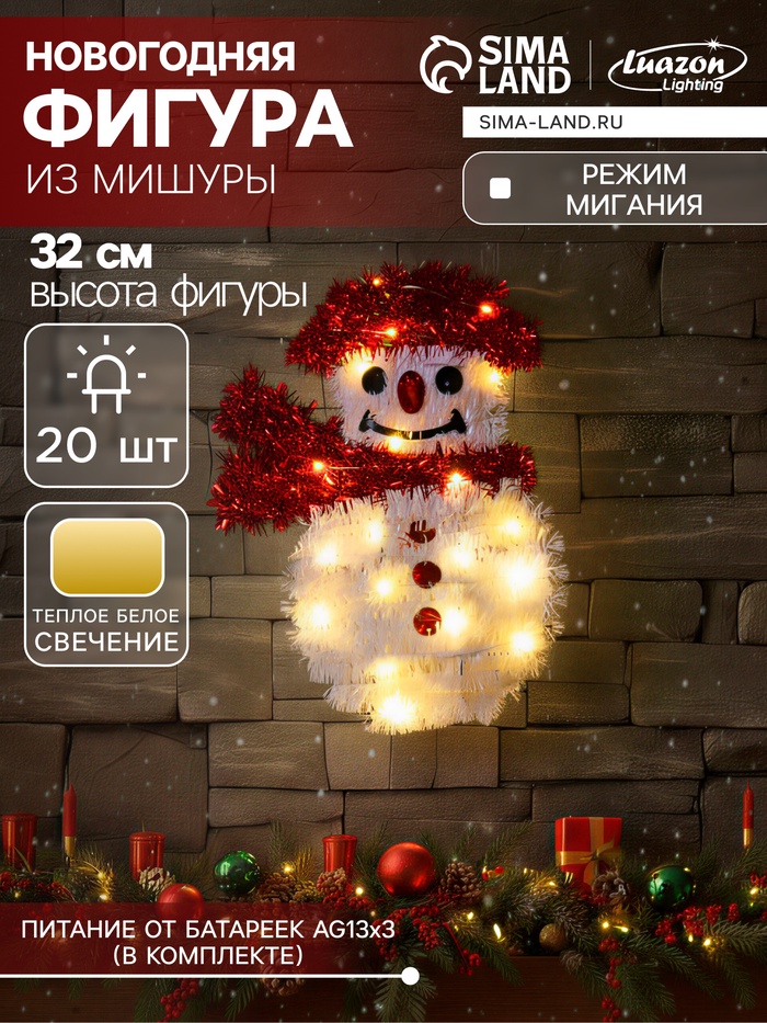 Светодиодная фигура из мишуры «Снеговик» 32×22 см, 20 LED, батарейки AG10×3 (в комплекте), свечение тёплое белое
