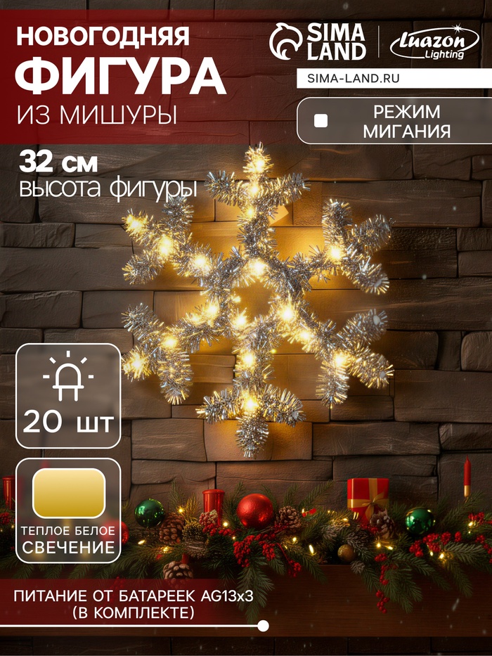 Светодиодная фигура из мишуры «Снежинка серебристая» 32×2 см, 20 LED, батарейки AG10×3 (в комплекте), свечение тёплое белое