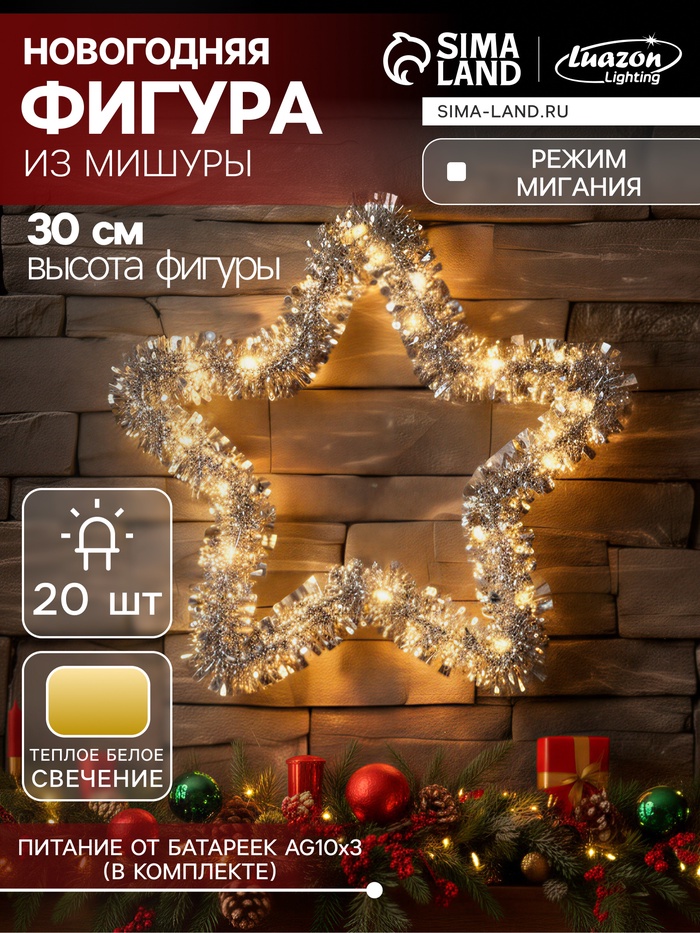 Светодиодная фигура из мишуры «Звезда красная» 30×5 см, 20 LED, батарейки AG10×3 (в комплекте), свечение тёплое белое