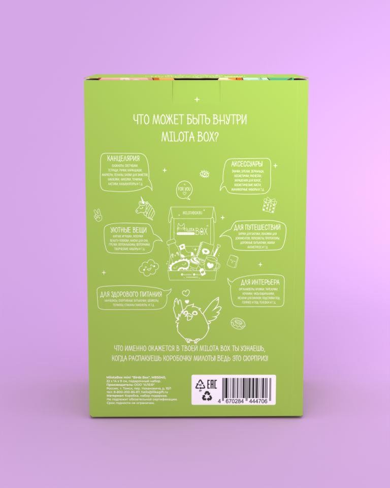 Каждая коробочка милоты наполнена необычными вещицами, которыми будет приятно пользоваться в повседневной жизни: милая канцелярия, уютные товары для дома, стильные аксессуары, предметы для здорового образа жизни и приятные мелочи. Внутри Milota BOX находится до 8 сюрпризов, упакованных в стилизованную подарочную бумагу тишью.