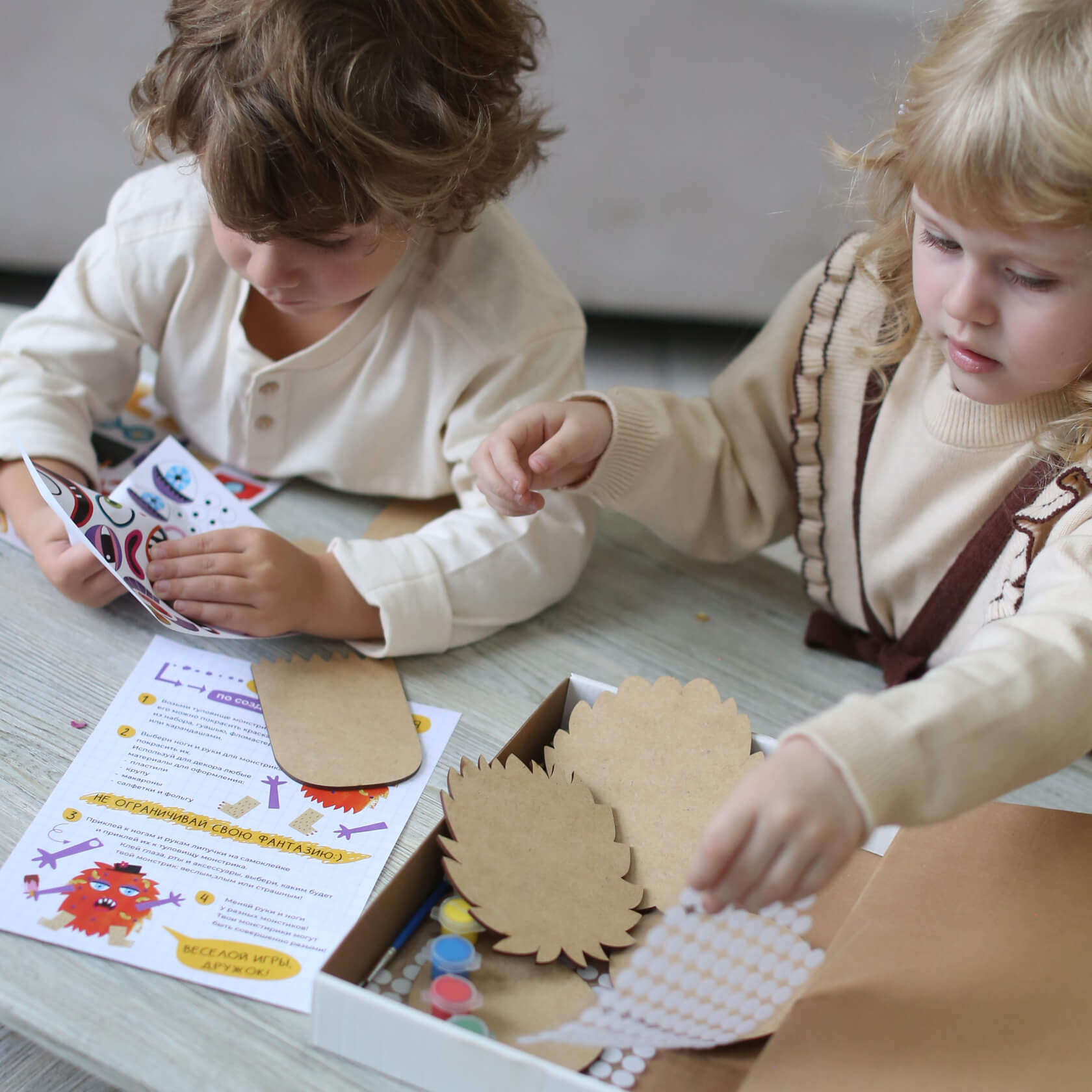 Для украшения фигурок мы вложили в набор наклейки, краски, кисточку, клей. Этот набор направлен на развитие фантазии у детей и творческого потенциала. Поэтому можно не ограничиваться предложенными инструментами, а использовать любые имеющиеся дома подручные материалы для создания своего монстра: карандаши, фломастеры, бумагу, пластилин, нитки, блёстки, ткани.