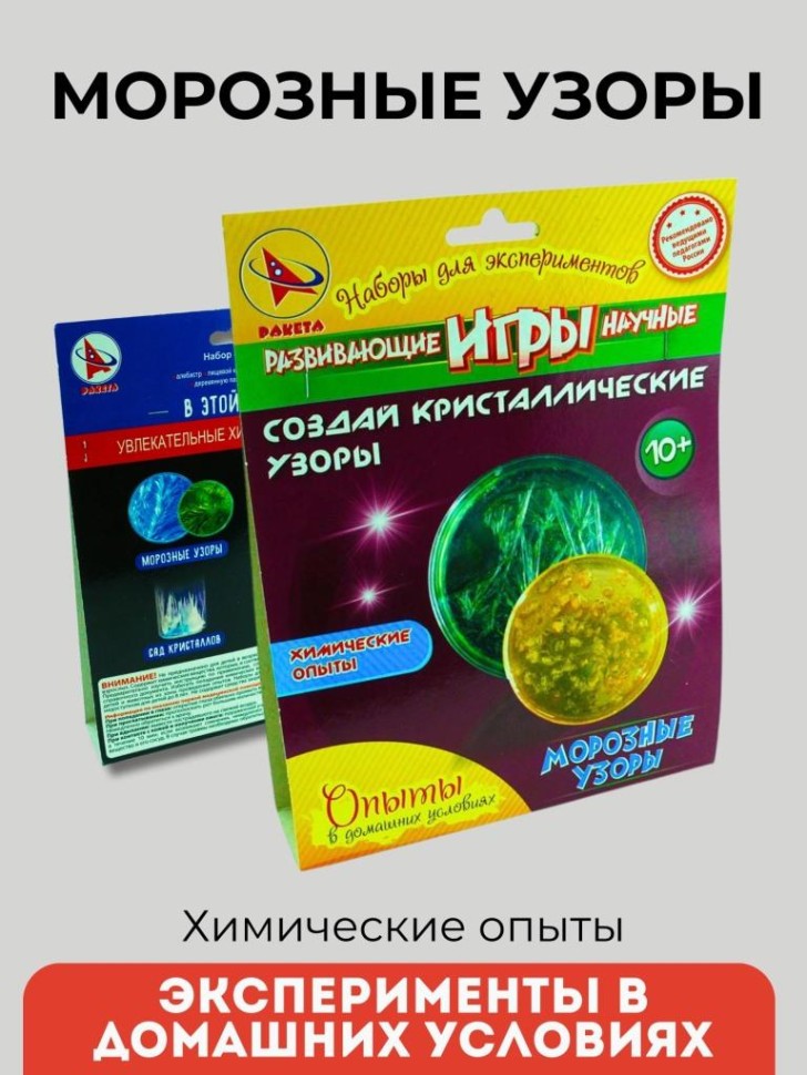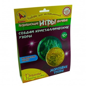 Набор для опытов Морозные узоры очень простой химический опыт предназначен для того, чтобы прямо у себя дома вырастить кристалл, внешне очень сходный с природным кристаллом. Он имеет причудливую форму, напоминающую зимние узоры на стекле.