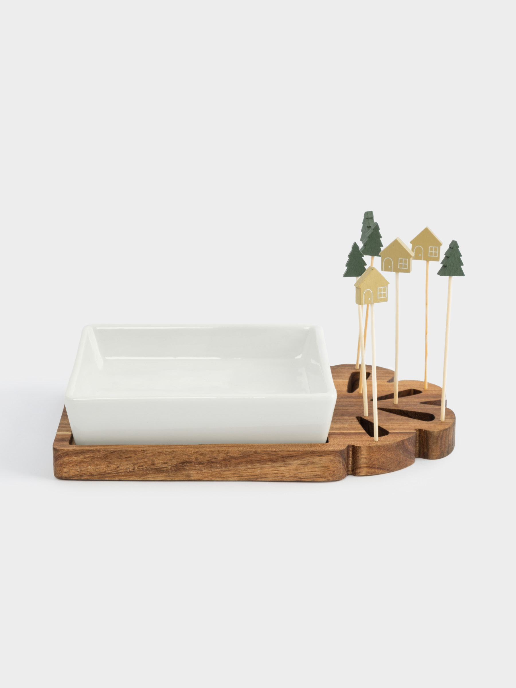 Набор для закусок, 2 предмета, на подставке, со шпажками. Комплектация и размеры: пиала - 1 шт, 13x13 см, подставка - 20x15 см, шпажка - 8 шт, 9 см. Материал: дерево акации, керамика. Рекомендации по уходу: мыть вручную с применением мягких моющих средств. Не использовать для ухода абразивные чистящие средства и жесткие губки. Пиалу без подставки и шпажек можно мыть в посудомоечной машине.