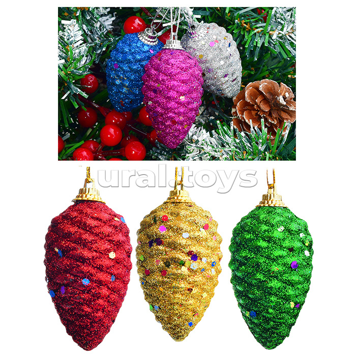 Min заказ: 1шт. • В наборе 6 ёлочных украшений в виде разноцветных шишек с блестками.