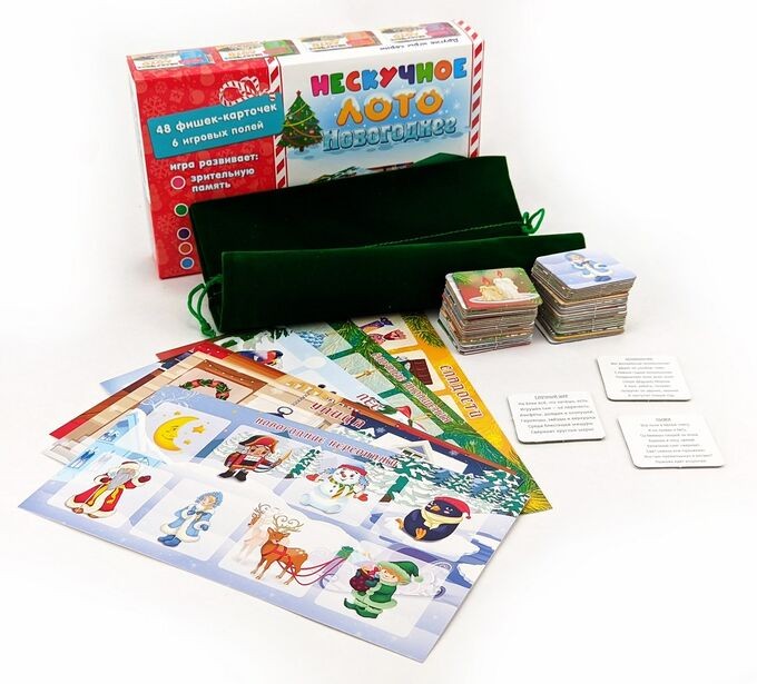 В нашем Лото фишки изготовлены из плотного картона, которые удобно лежат в руке. Мешочек выполнен из бархатной ткани и похож на мешок Деда мороза с подарками. Все картинки объединены по тематике, и на задней стороне карточек-фишек есть новогодние стихотворения, которые привнесут в игру атмосферу этого замечательного празника. Вам останется только нарядить елку и поставить мандарины на стол!