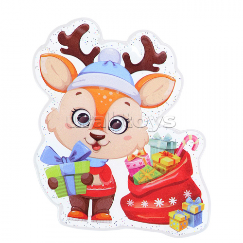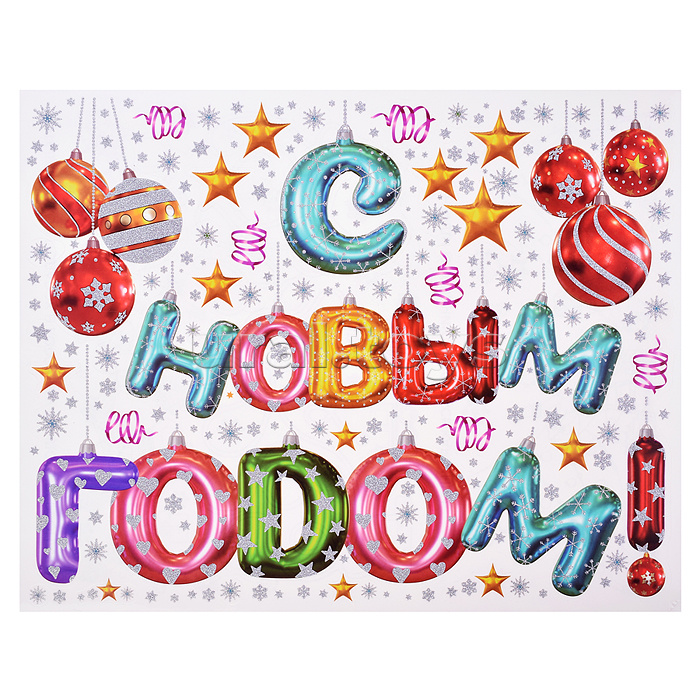 Новогоднее оконное украшение из ПВХ пленки "Надпись с шариками" декорировано глиттером (крепится к гладкой поверхности стекла посредством статического эффекта) с раскраской на картонной подложке 30х38см