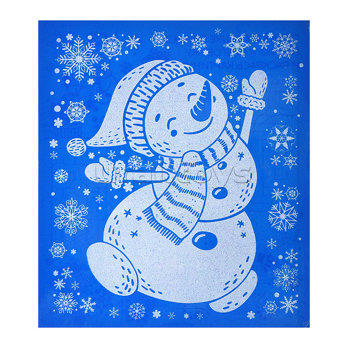 Новогоднее оконное украшение из ПВХ пленки "Снеговик" декорировано глиттером (крепится к гладкой поверхности стекла посредством статического эффекта) с раскраской на картонной подложке 15,5x17,5см