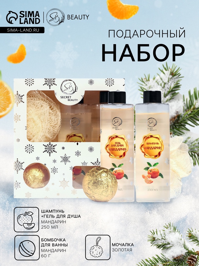 Новогодний подарочный набор косметики SB BEAUTY, шампунь, гель для душа, бомбочка, мочалка, с ароматом мандарина