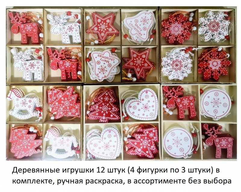 Набор елочных деревянных игрушек в ассортименте, 12шт