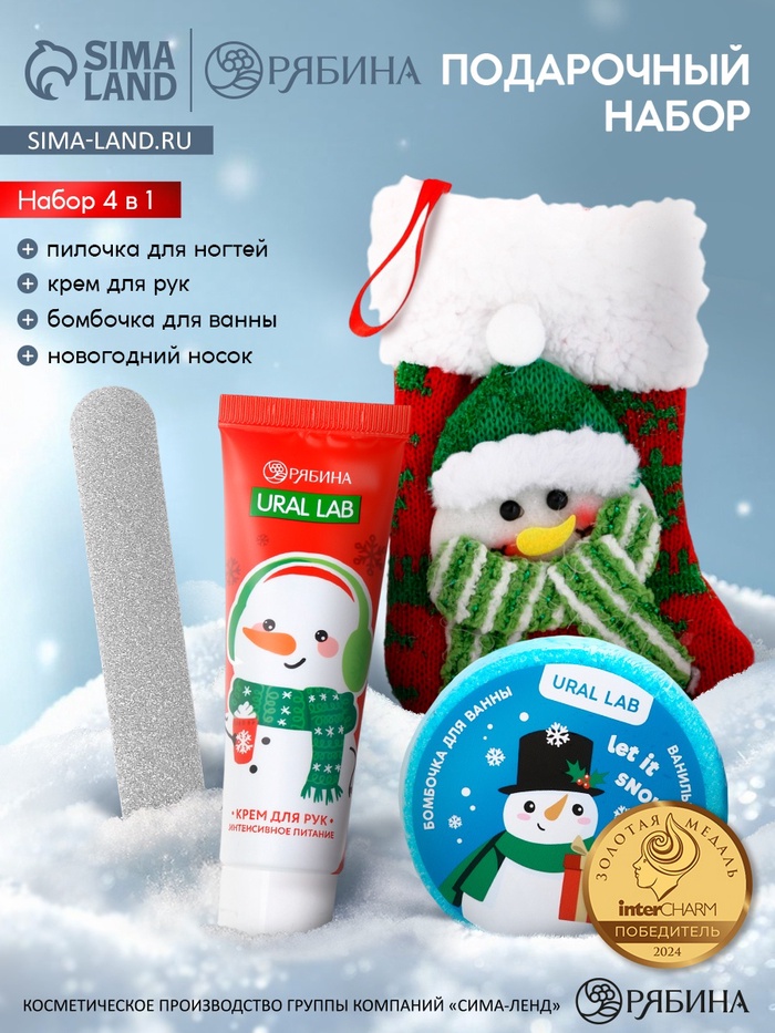 Подарочный набор в новогоднем носке «Снеговик», крем для рук, бомбочка для ванны и пилка для ногтей, URAL LAB