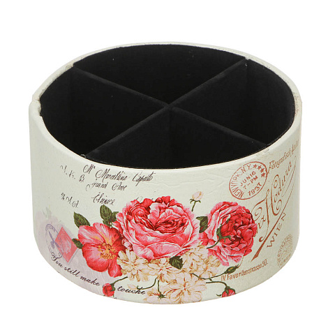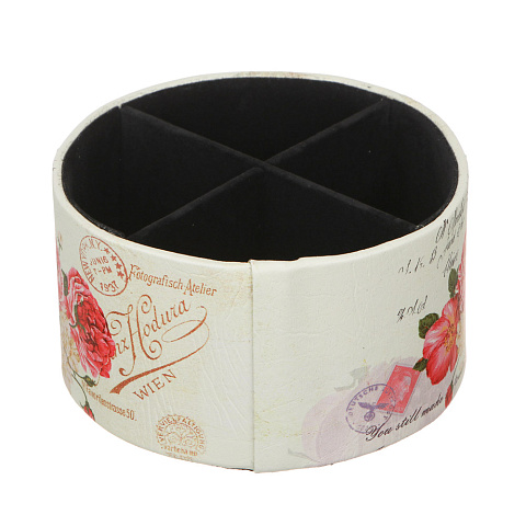 Шкатулка для украшений круглой формы с цветочным декором без крышки станет красивым и практичным помощником в хранении домашних мелочей. Размер 14,5x14,5x9,8 см. Такая шкатулка станет необходимым аксессуаром дамского туалетного столика и гармонично дополнит спальню или гардеробную. Аксессуар открытого типа имеет жесткий корпус и устойчивое основание, содержит 4 одинаковые ячейки с отделкой из мягкого материала, который препятствует образованию царапин на украшениях. Не займет много места на столе, полке или в ящике. Удобная и стильная шкатулка сохранит любимые украшения. Аксессуар можно использовать также для хранения косметических принадлежностей.