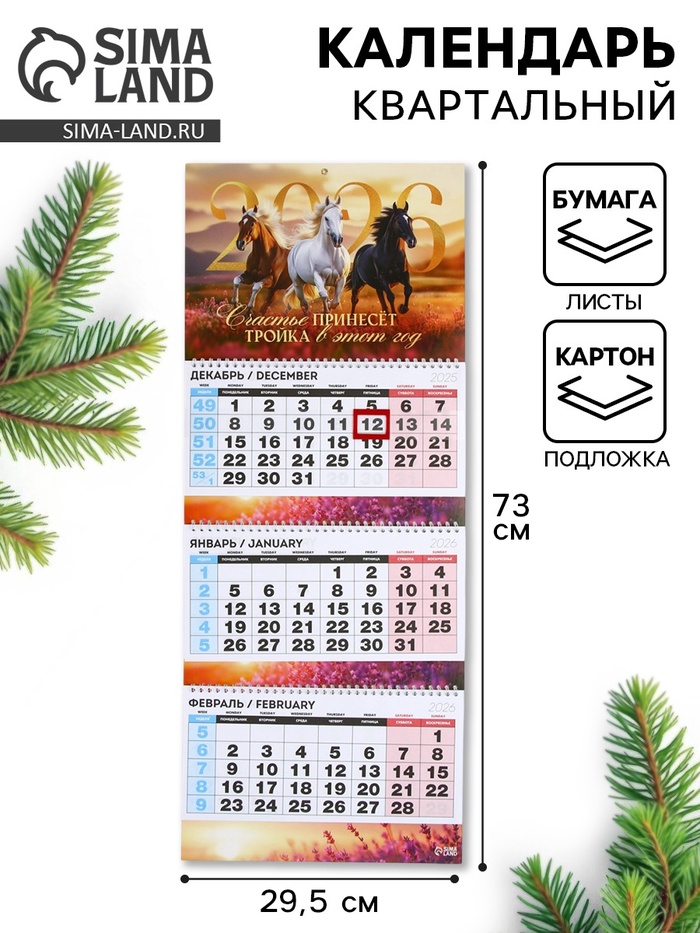 Календарь настенный квартальный 2026 «Тройка лошадей»