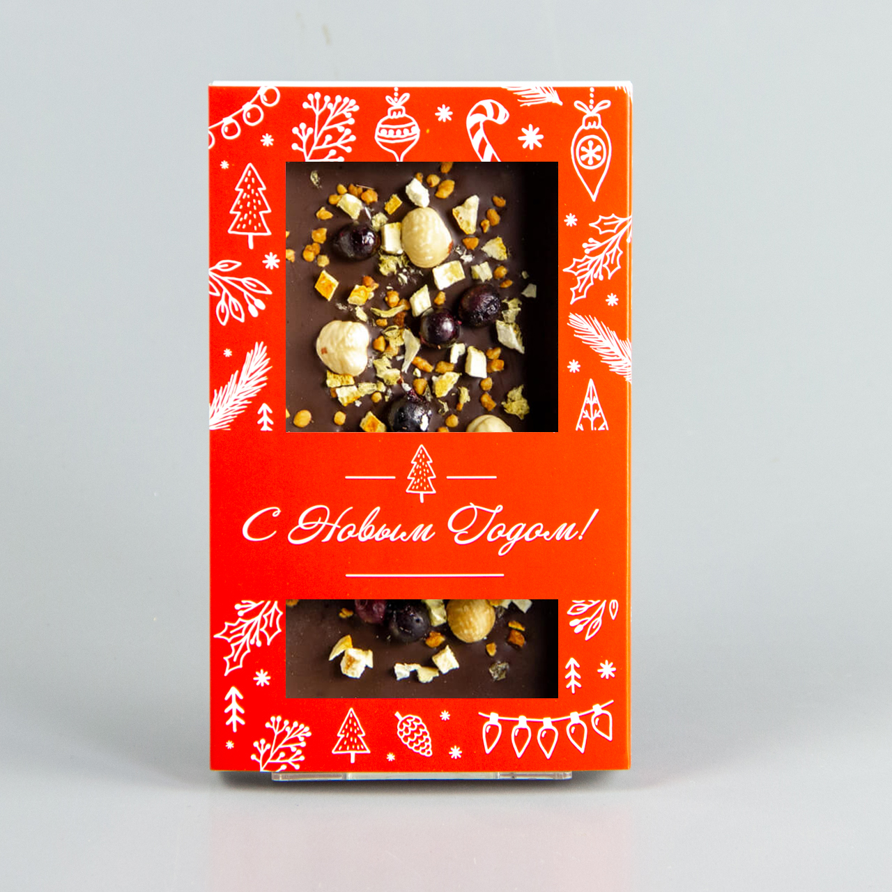 Тёмный шоколад с апельсином, чёрной смородиной, фундуком и карамелизированным фундуком, красная коробочка #5