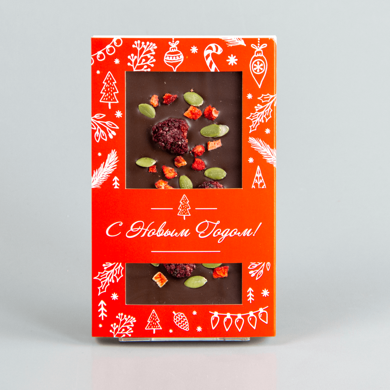 NEW! Тёмный шоколад с клубникой, ежевикой и семечками тыквы, красная коробочка #27