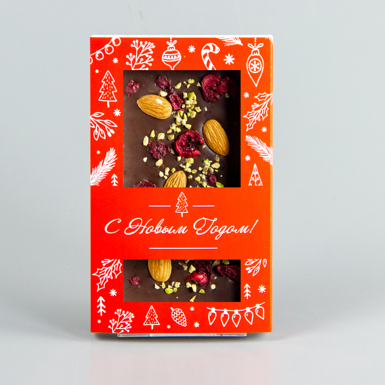 Тёмный шоколад с вишней, фисташками и миндалём, красная коробочка #14