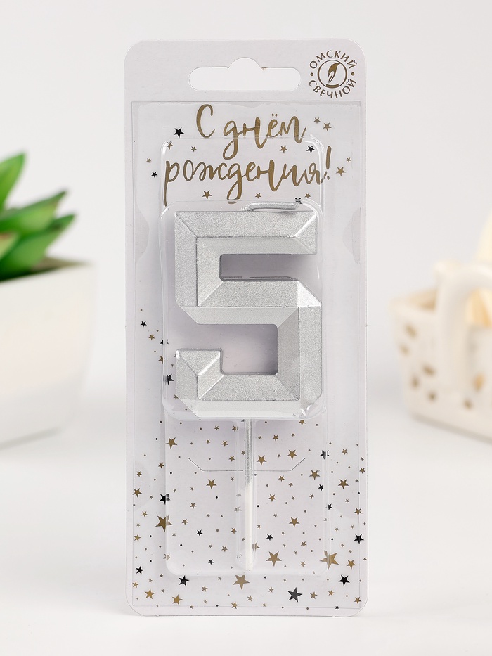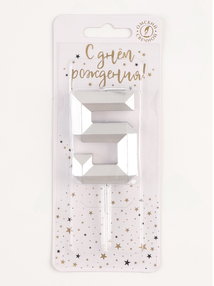 Свеча в торт на шпажке «Серебряные грани», цифра 5, серебряная