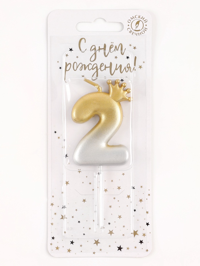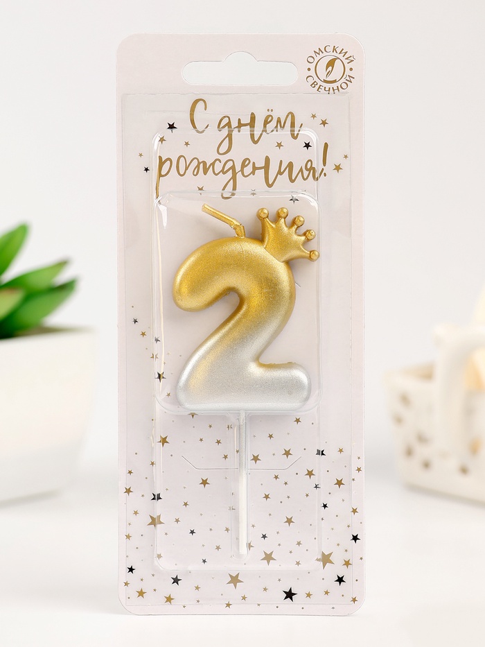 Свеча в торт «С короной», цифра 2, золото - серебро