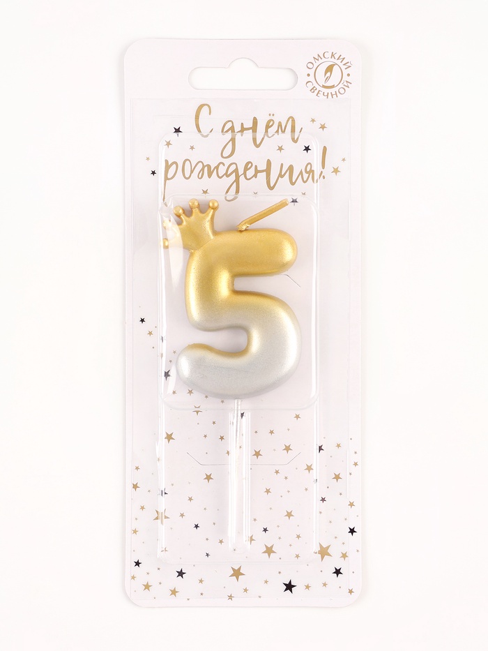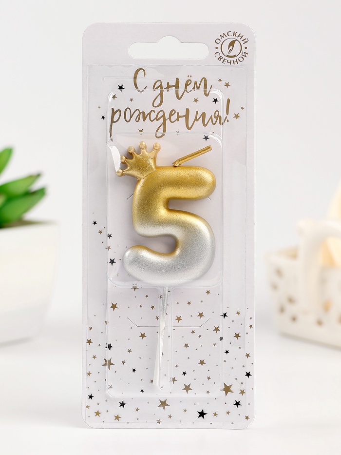 Свеча в торт «С короной», цифра 5, золото - серебро
