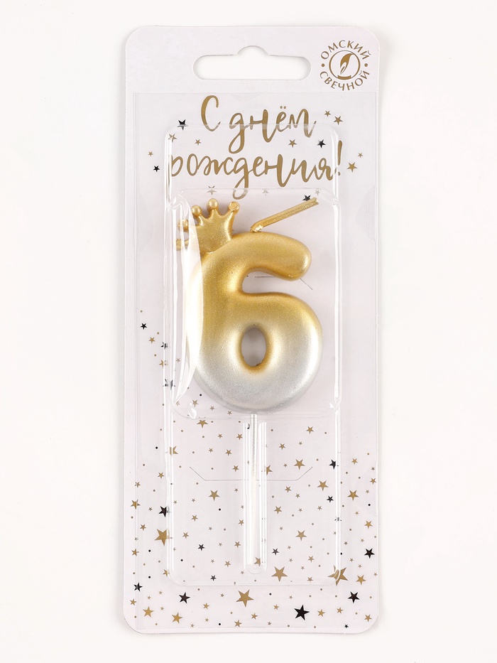 Свеча в торт «С короной», цифра 6, золото - серебро