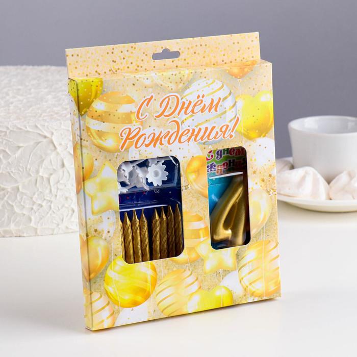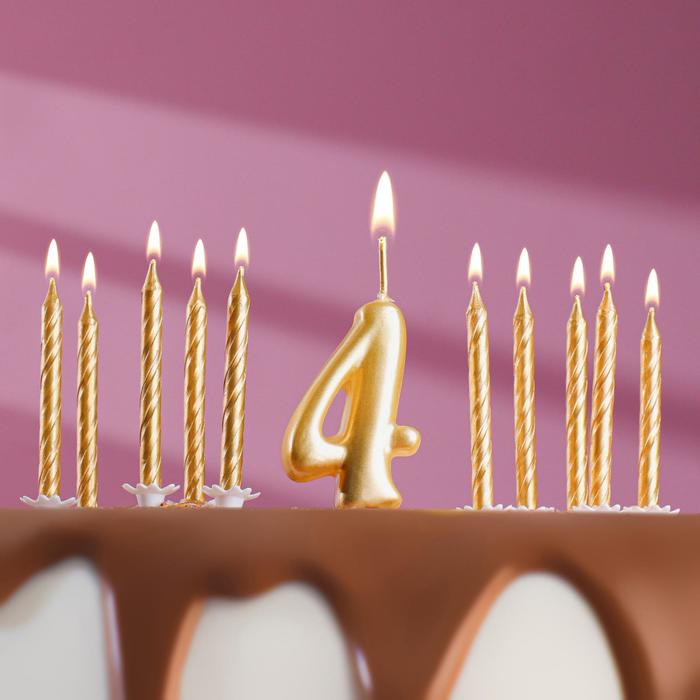 Свечи для торта «С Днём Рождения»: цифра 4 + классические, золотые 10 шт., 7 см