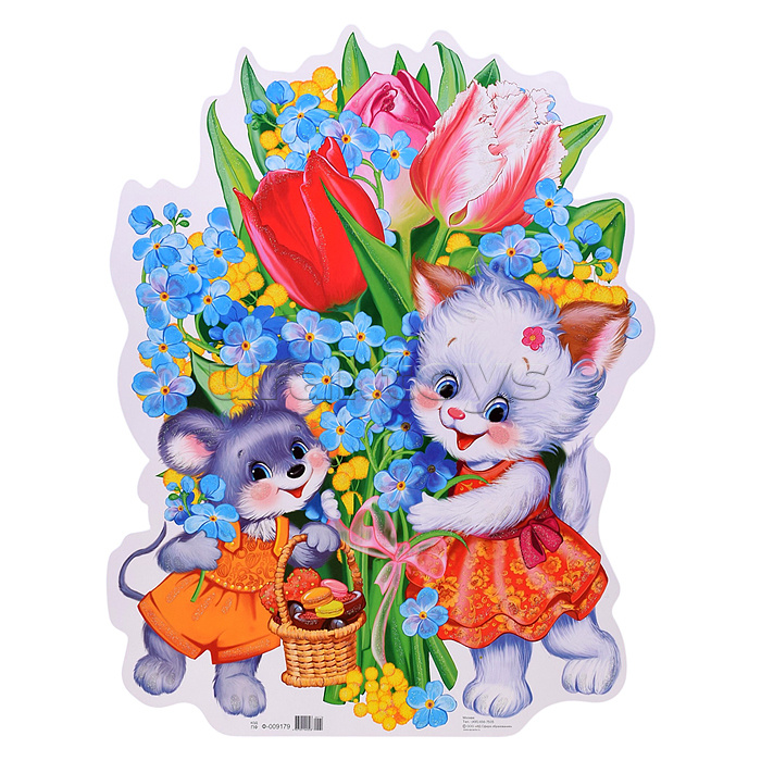 Плакат вырубной А3 в пакете. Зверушки с букетом (блестки, УФ-лак, в индивидуальной упаковке, с европодвесом и клеевым клапаном)