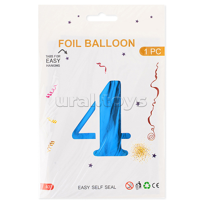 Шар (40''/102 см) Цифра, 4, Синий, Металлик, 1 шт. в уп.
