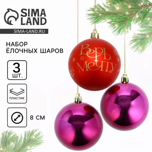 Шары ёлочные новогодние «Верь в мечту!», пластик, d=8, 3 шт., красные, винные