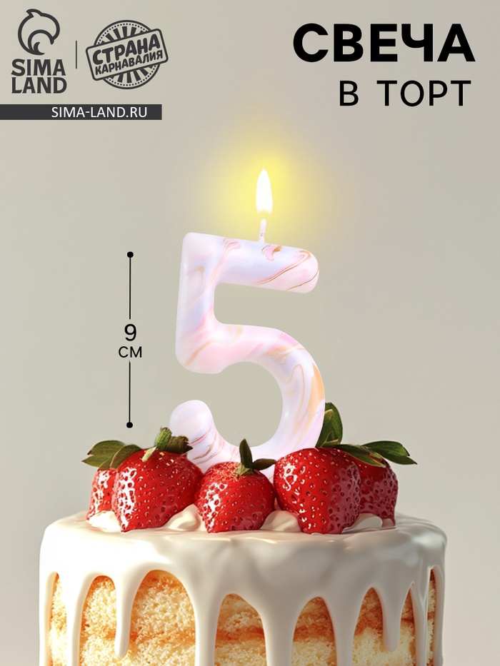Свеча в торт «Белый мрамор», цифра 5, ГИГАНТ, 9 см