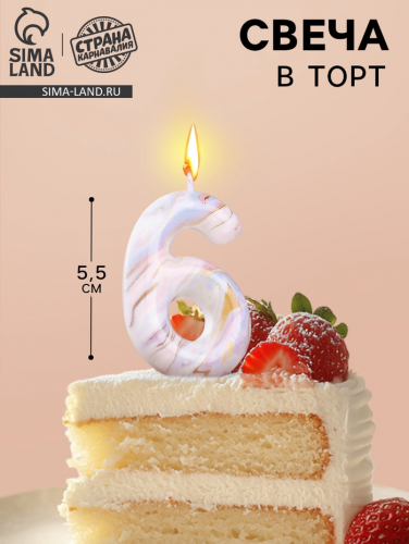 Свеча в торт «Белый мрамор», цифра 6, 5.5 см