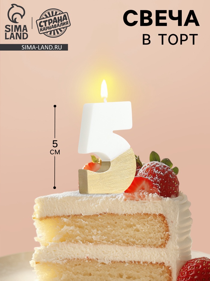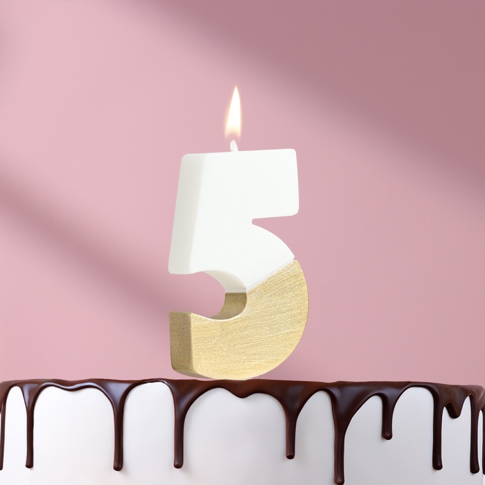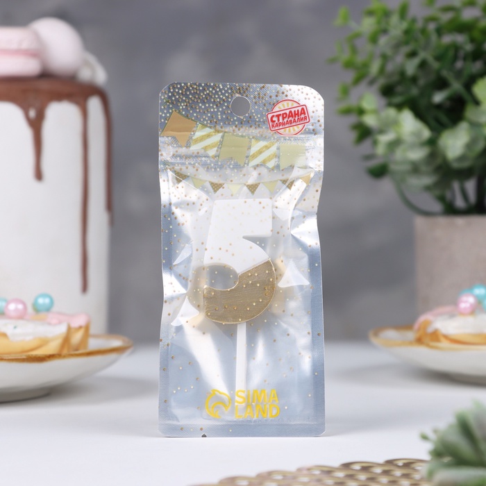 Свеча в торт «Манхеттен», цифра 5, белая с золотом, 5 см
