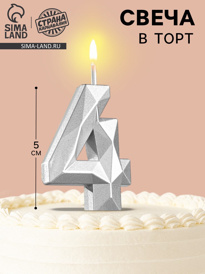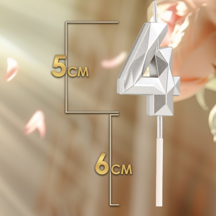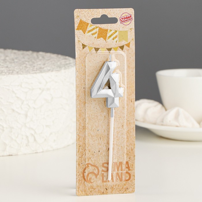 Свеча в торт на шпажке «Алмаз», цифра 4, серебряная, 5×2.6 см