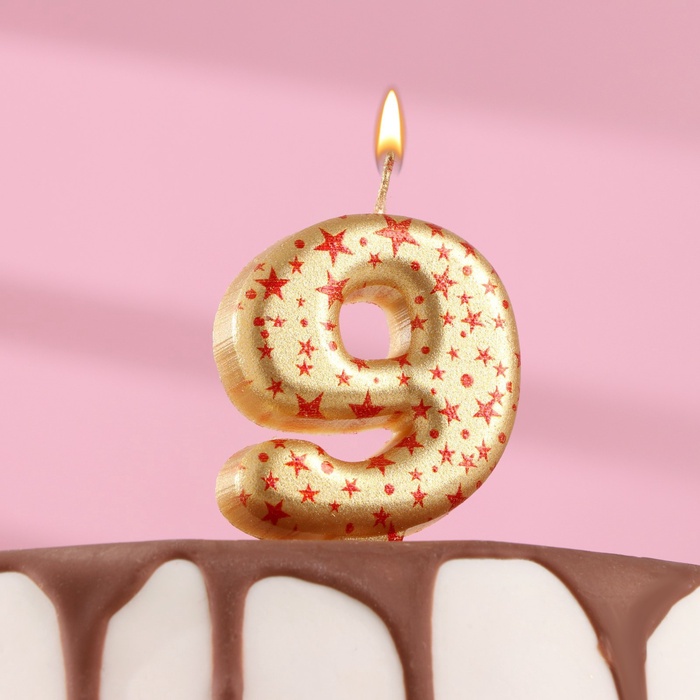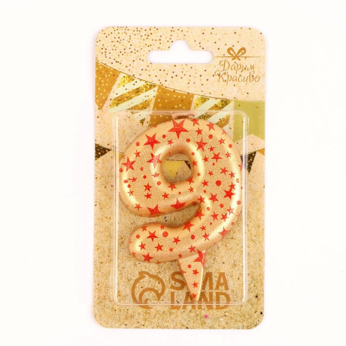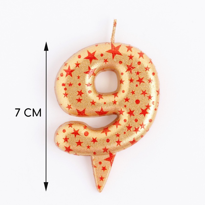 Свеча в торт «Саната», цифра 9, золотая с красными звездами, 5.5 см