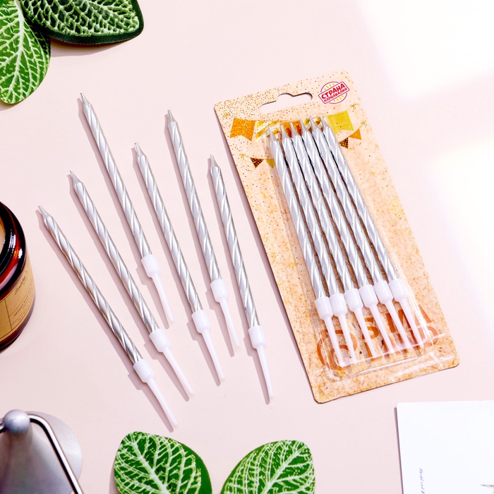 Свечи в торт «Металлик», 14 см, 6 шт. с подставкой, серебристые