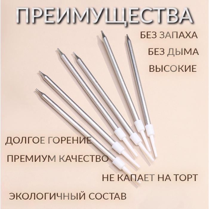 Свечи в торт «Ройс», 6 шт., высокие, 13 см, серебристый металлик